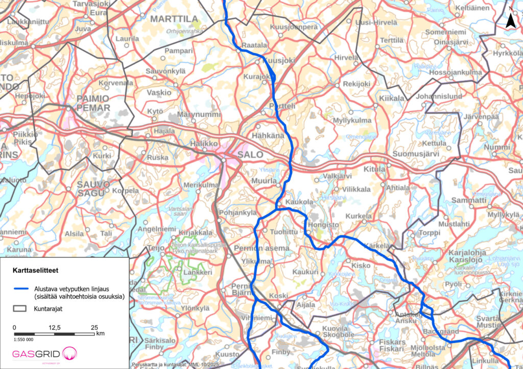 Alustavan linjauksen mukaan Meri-Lapista etelään tuleva putki jakautuisi Salossa Muurlan Kaukolassa toisaalta kohti Inkoota ja toisaalta kohti Hankoa.
