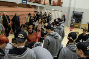 Paikalle juhlistamaan oli saapunut etenkin juniori-ikäisiä lapsia ja nuoria, jotka pitivät huolen, että reilu viikko sitten lauantaina Nokialla mestaruuden voittanut perniöläisjoukkue pääsi kunnostautumaan koripallon lisäksi tänä keväänä myös nimikirjoitusten kirjoittamisessa.